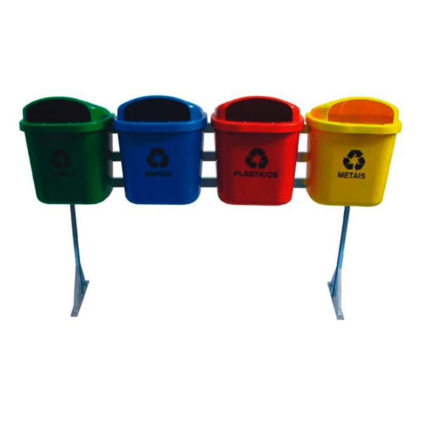 cestos e tampa são injetados em plástico polietileno de alta densidade com proteção UV e a estrutura metálica é confeccionada em aço carbono.
